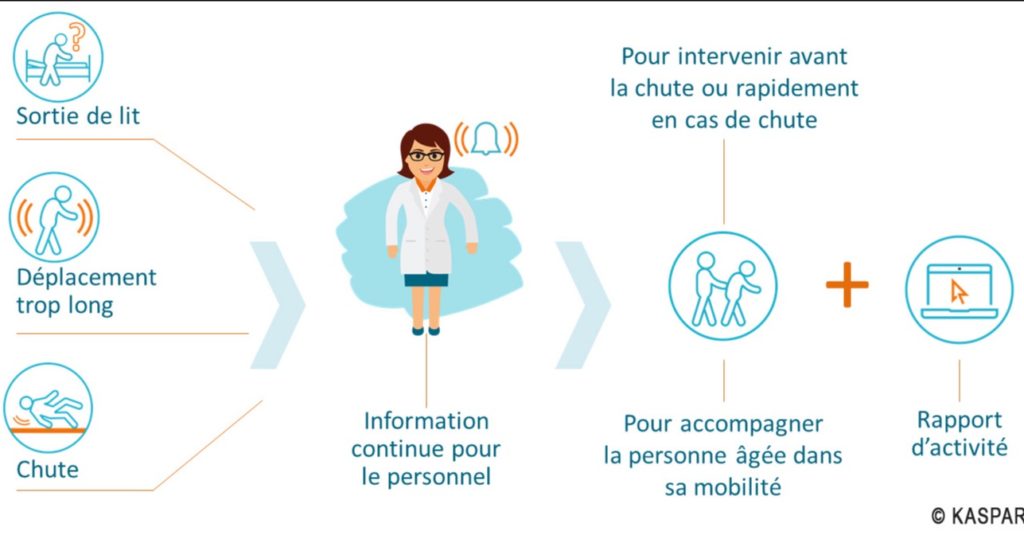 Le dispositif de surveillance Kaspard donne l’alerte aux soignants en cas de sortie de lit anormalement longue ou en cas de chutes, pour une réactivité optimale.